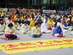 报导说,江XX芝加哥行程,全都是在下榻饭店内进行,饭店四周道路,成了抗议及欢迎人潮的必争之地,早上8时起即到现场的法轮功学员抢到饭店正门的绝佳位置,并一路长长挂起了各式标语,近千名身着黄色棉衫的学员,或坐或站双手合十,场面相当壮观。