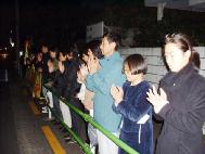 9:00整,记者从现场发来的消息说“迎江”队没有看见江的车队。法轮功学员迅速移到机场外的公路两侧打开“法轮大法好”等横幅。“迎江”队的巴士列队从学员的横幅夹道中驶过,其中有些巴士司机向路边的法轮功学员鸣笛致意,车上的一些中国学生则向法轮功学员挥舞手中的小型中美国旗打招呼。
