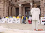 今晨8:30左右,维科(WACO)的德州科技大学机场(TSTC)大约有两百名法轮功学员正在炼功,“迎江”队一直未见踪影。连夜从休士顿赶往维科参加和平抗议的美东法轮功学员张太太从机场打来电话,说在休士顿西北一百多英里外的维科今天天气很冷,感觉上只有华氏40多度,与只需身着T恤衫的休士顿形成较大反差。