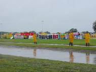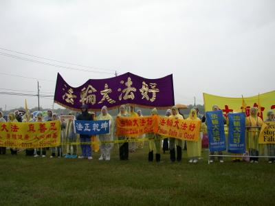 今天上午10:00开始,1500多名法轮功学员汇聚到克劳福得市的唐卡瓦瀑布公园(Tonkawa Falls Park),在宽阔的草坪上席地而坐,每隔15分钟发正念,间歇炼功。大家昨夜连夜因赶路一夜未眠,但看上去精神都很好。今天克劳福得的温度不到华氏50度,草地潮湿,阴云低垂。当地同季节平常的最高温度为华氏76度,最低52度。现场的法轮功学员很多身着单薄的黄T恤,有些为御寒穿上了雨衣,少数穿上了厚厚的夹克,大家都静静地坐在草坪上,一片凝重。“迎江”队的成员把旗子与横幅丢弃在草坪上,全部躲进租用的大巴士内保暖。
