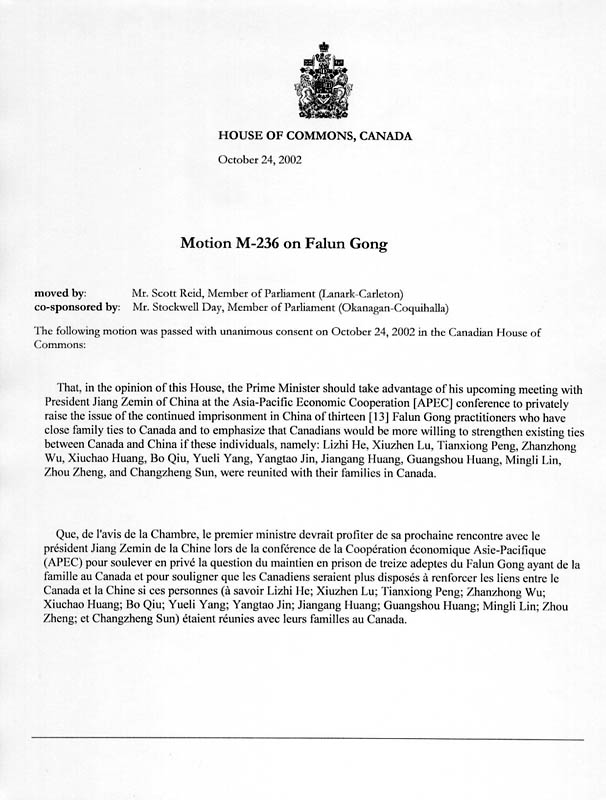 这是加拿大国会众议院提出并通过的第一个关于法轮功的动议案(Private Motion)。这项动议案是由国会议员斯科特-瑞德先生提出,并由国会全体通过。