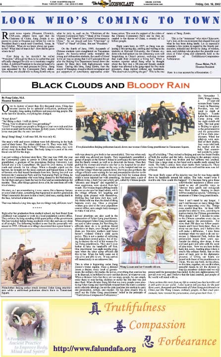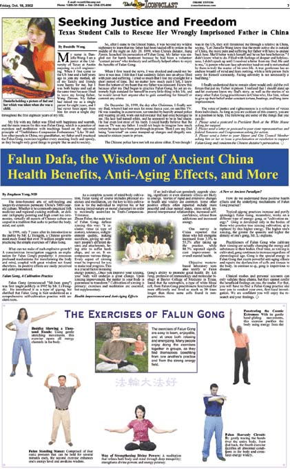 2002年10月18日,德克萨斯州克劳福德市创办135年之久、最有影响力的英文报《Iconoclast 》,用两个整版的篇幅介绍了法轮功学员在中国遭受迫害的情况,以及法轮功在祛病健身等方面的神奇功效。 报导转载了休士顿居民戴安娜.罗伯特博士的题为“看一看是谁要来我们的小镇”。有关中国的这位来访者, 罗伯特博士提出了一系列问题。“我们对这位即将到来的客人了解多少呢?他究竟是个什么样的人?他是如何爬到现在的位置的?