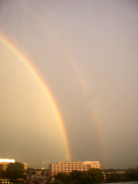 昨天下午,很多法轮功学员在洲际酒店外伫立发正念,脚下是大雨浇出的泥泞与湍急的流水。学员们身着黄、兰雨披巍然不动的身姿在洲际酒店门外的公路旁形成了一道独特的风景线。大约傍晚6时左右,云裂空晴,洲际酒店东北方上空的近处搭起两道清晰的彩虹。