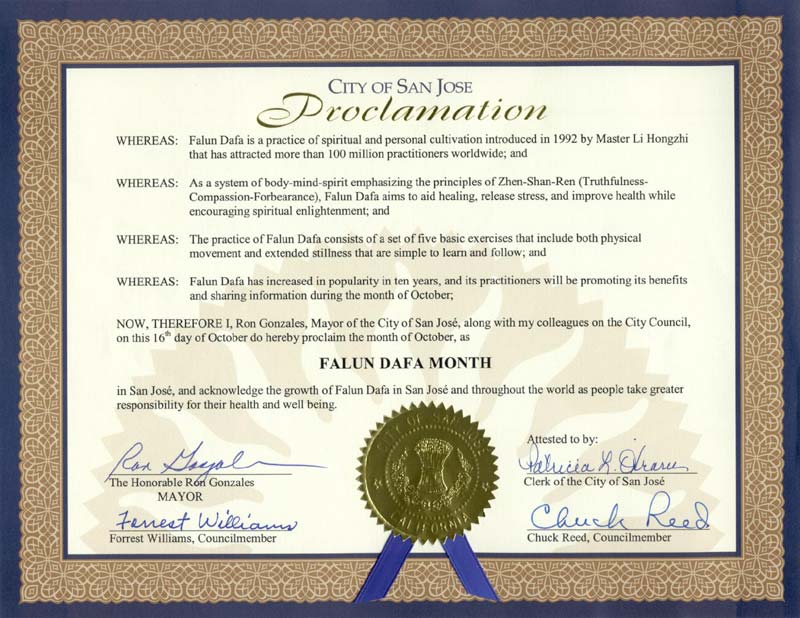 因此,现在,我,圣荷西市市长罗·冈萨雷斯以及我在市议会的同事们,于十月十六日特此宣布:十月为圣荷西市的法轮大法月。