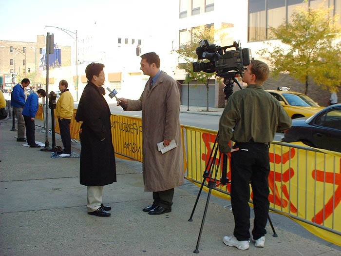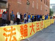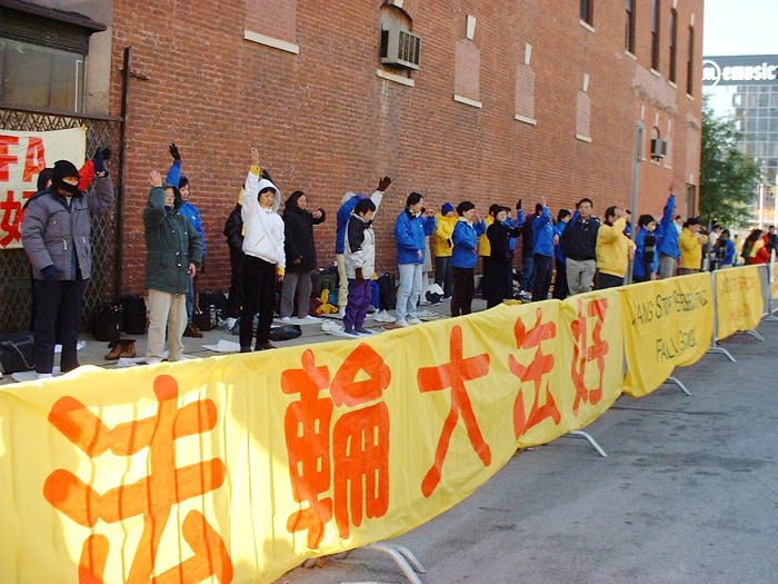 当迫害法轮功的元凶江XX10月22日到达芝加哥时,除了上千名法轮功学员在机场及江停留的酒店外静候外,在芝加哥中国领馆前还有上百的法轮功学员和平抗议江XX的残酷迫害。