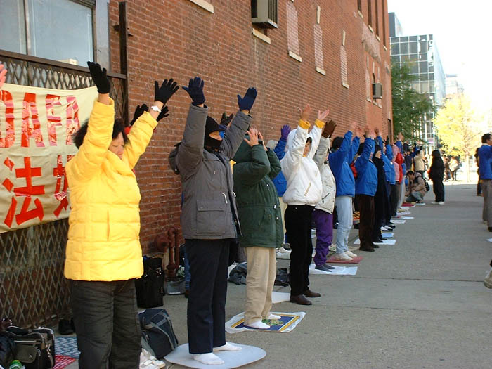 | 法轮功学员在酒店前炼功及和平请愿 | |