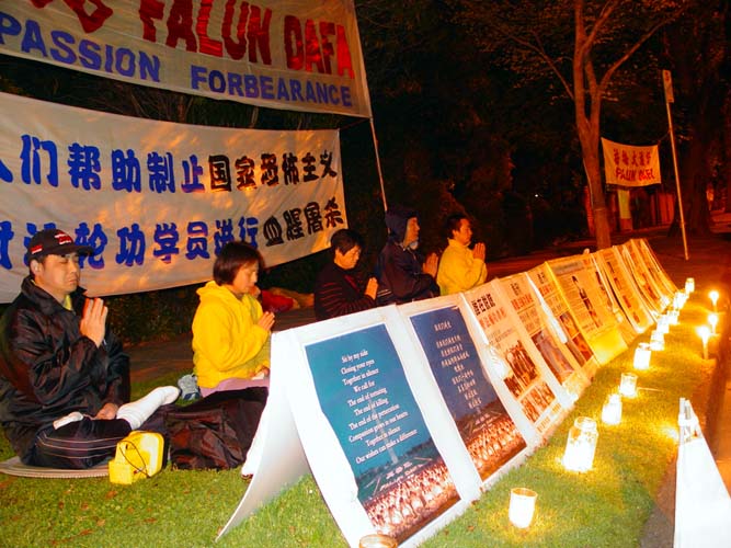 【明慧网2002年10月27日】二百名法轮功学员10月25日晚在香港遮打花园举行烛光守夜活动,和平抗议江XX迫害法轮功,并呼吁国际社会共同制止这场全球范围的恐怖迫害。这是正法与用纯净的正念清理另外空间邪恶物质因素的全球活动的一部分。