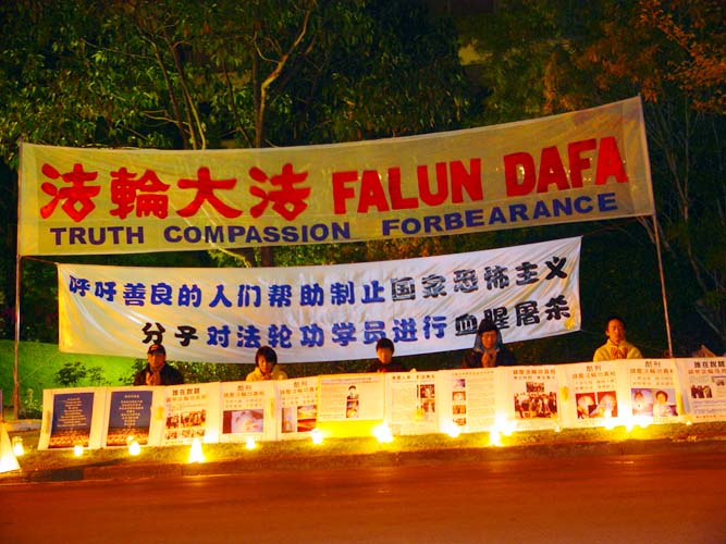 大约有二十人聚集在洛斯卡洛斯抗议中国[江氏]政府迫害法轮功,法轮功的支持者把中国[江氏]政府对法轮功的迫害比喻成小型的种族灭绝。他们指出中国有数以万计的法轮功学员被迫害致死或受到监禁。
