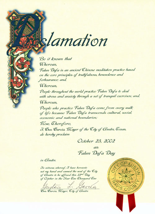 加州寇彩拉市市长璜.迪拉拉(Juan De Lara)2002年10月14日向法轮功颁发褒奖令,表彰学员献身公共服务事业并致力于改善人们的身心健康。