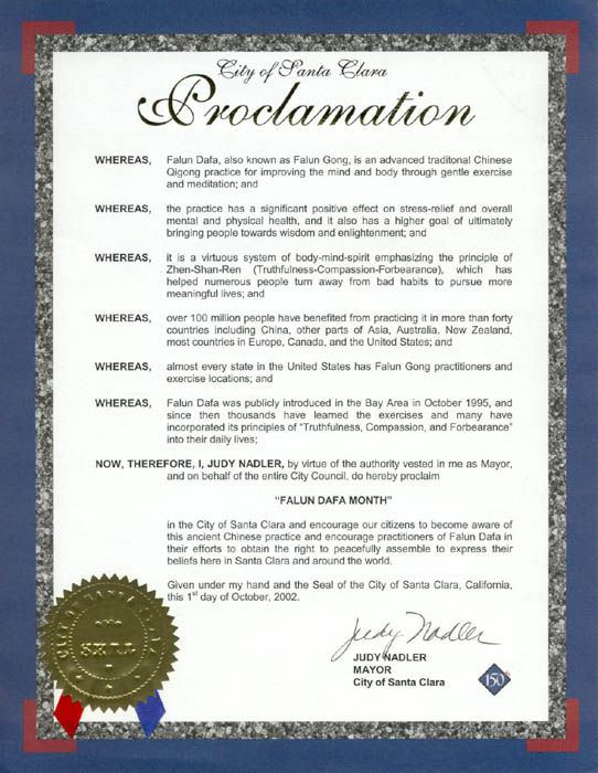 并且鼓励我们的市民了解这个古老的中国功法,同时也鼓励法轮大法学员通过他们的努力在圣塔克拉拉市和全世界去获得和平集会表达他们信仰的权利。