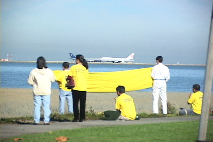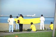 和100名身穿黄色衣衫的法轮功学员一起,他在威斯汀旅馆旁边的一个风景宜人但鲜为人知的绿色地带──湾前公园,举着大家已经熟悉的中、英文横幅。
