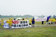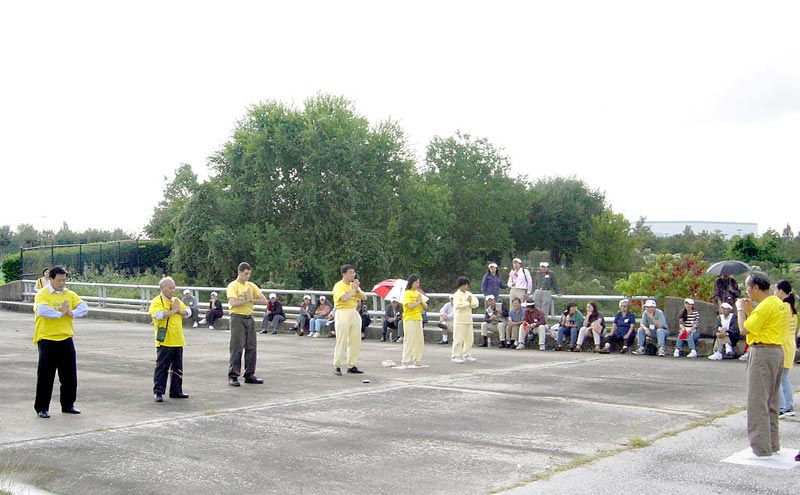 被中领馆拉来的“欢迎队”已无心于他们要欢迎的人,而是坐在桥下休息,映入眼帘的是法轮功优美的五套功法。我们感觉对这些可贵的中国人来说也是一次难得的正面了解法轮功的机会。