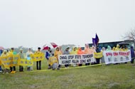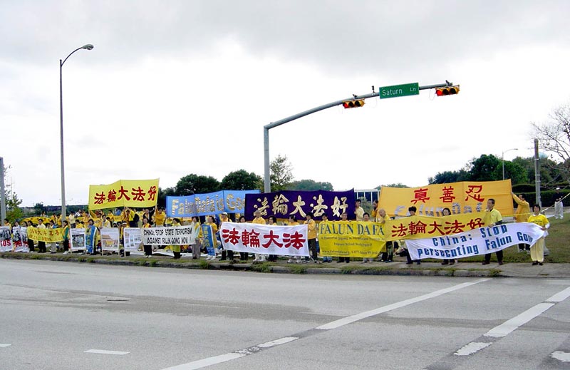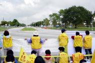 10月24日下午,各国法轮功学员千里迢迢,自费赶到德州,在NASA(美国国家宇航局)的对面大道上和平抗议江XX。只见穿黄色衣服的法轮功学员遍布整个草坪,或静坐,或手举横幅,气氛庄严祥和。