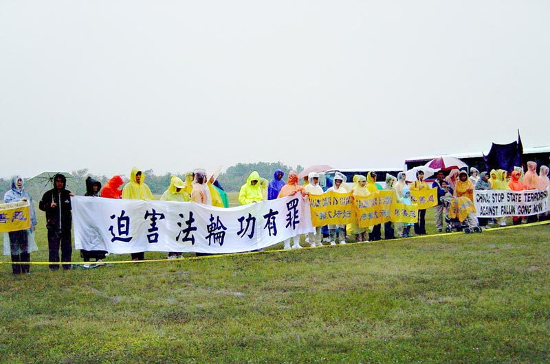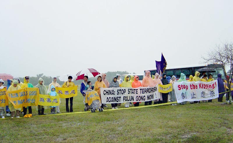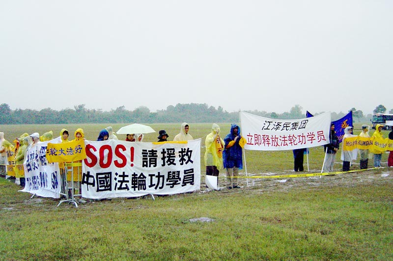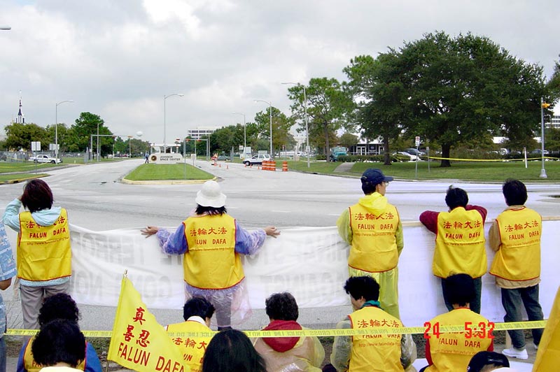 10月23日,五百多名法轮功学员来到了休斯顿阿灵顿机场。阴沉的天气对法轮功学员没有任何影响。他们沿着美国警察设立的黄色警戒线摆开了上百条横幅。在仅隔一条街的草地上,有几十个人组成了“欢迎”江xx的队伍。在江的飞机到达机场前的一个小时,天空开始出现急驰的黑云并向机场方向压下来,同时怪风突起,雨点急落。随着江的飞机到达机场的时间越来越近,风雨也越来越大。法轮功学员个个稳如金刚,并持续发出正念,清除另外空间的败坏物质。