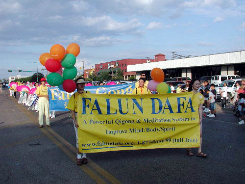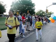 10月1日下午5:30分,游行队伍由维科市市政府大楼前缓缓出发,参加此次游行的共有150个机构,法轮功学员的队伍也在其中。两个学员打着写有“法轮大法”的大旗走在前面,紧接着是身着仙女衣衫的女学员们跳着扇子舞,翩翩而行,观众对她们优美的表演非常的喜爱,一路上掌声不断。身着黄色T恤衫的学员们向观众们派发着大法的真相材料,人们高兴的接过资料,向学员表示感谢!更令人惊奇的是有的孩子还做着合十的动作接大法资料。