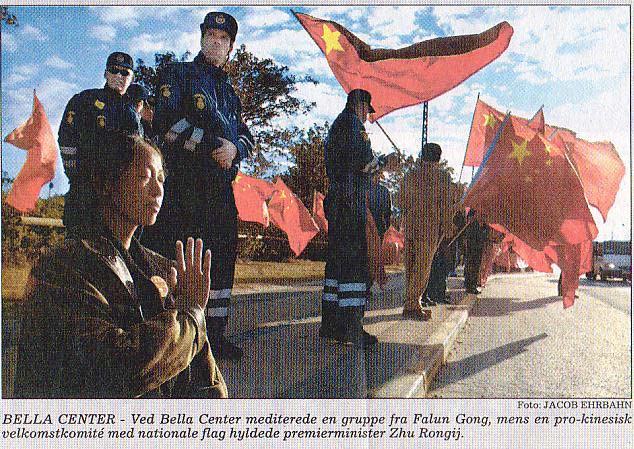 图三图三是刊载在第四版的照片,文字说明:“百勒中心(欧亚高峰会地点—译者注)—在百勒中心附近,一群法轮功学员正在打坐;与此同时,一个欢迎委员会摇着(中国) 国旗在欢迎中国总理。