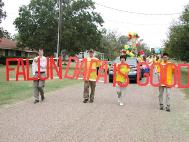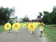 5日上午,附近其它城镇的居民及远道而来观光的游人早早地就赶来,在路边等候观看游行。十点,游行队伍从克劳弗的学校门前的广场出发走向主街,身着金黄色衣服的法轮功队伍缓缓而行,前面是“法轮大法”、“真、善、忍”横幅,紧随的是装饰漂亮的花车,几位身着炼功服的法轮功学员站在花车上演示功法,祥和、宁静。由十名法轮功女学员组成的中国传统舞蹈队舞姿优美,展现了中国传统文化的美好,受到人们的热烈欢迎。