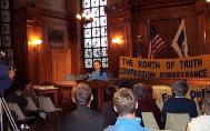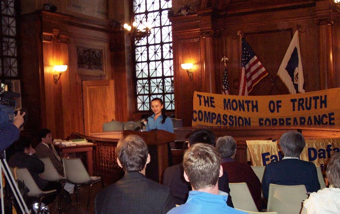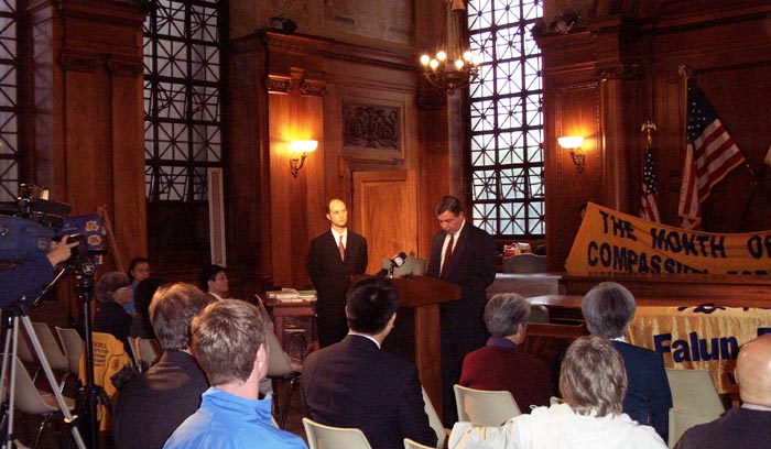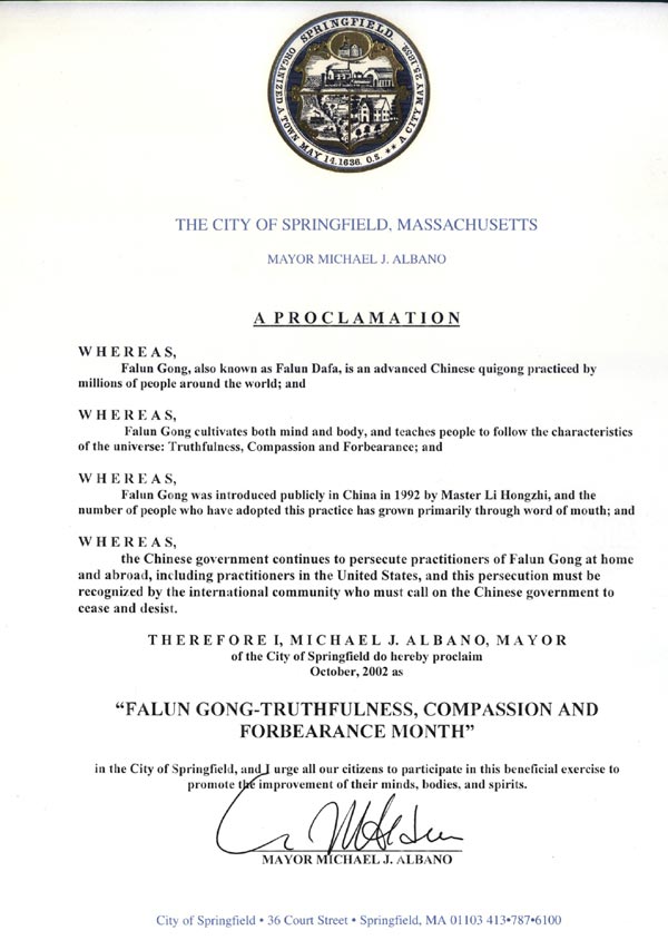 春田市市长迈克·阿尔波诺(Michael J. Albano)先生出席了新闻发布会。在这之前,春田市市长已两度嘉奖法轮功。他宣布2002年10月为春田市“真善忍月”,并作了简短的讲演。他在讲演中说,中国对于法轮功的持续迫害是对人权的迫害,而国际社会必须认清这一迫害并要求中国政府停止这一迫害。他说,颁发这一嘉奖就是要公开我们对这一问题的立场,我代表全体春田市的人民呼吁中国政府停止这一迫害。他在讲话中表彰法轮功学员把这有益于身心健康的修炼通过免费的学习班带给春田市市民,并受到他们的欢迎和喜爱。他还进一步鼓励春田市的居民加入法轮功这一有益于身心健康的修炼。来自康州的西人学员思克特(Scott)主持了新闻发布会,并宣读了一项声明,呼吁各级政府、媒体,和所有善良的人们关注此事,帮助营救在中国遭受迫害的亲友。来自纽约的学员吴雪原代表法轮功学员感谢市长先生和春田市人民对法轮功的一贯支持,并讲述了她的母亲,一位物理学教授因坚持修炼法轮功而遭受的迫害。来自哈佛大学医学院的何海鹰博士讲述了他的亲人们在中国因炼法轮功而受到的迫害。在场的人们都被他们的真实故事而震撼。