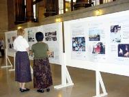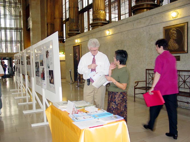宽敞的市政大厅正中央,学员们精心制作的“正法之路”图片一字排开,十分引人注目。十月一日至四日,为期四天的图片展使匹兹堡市政大厅显得格外祥和,大法的殊胜之场吸引了许多有缘之士。善良的匹兹堡人震惊于法轮功目前在中国所遭受的残酷迫害,很多人纷纷前来索要寄给布什总统的明信片,希望能帮助早日停止这场迫害。一贯真诚支持法轮大法的匹兹堡市市政会成员WILLIAM PEDUTO 也特意前来观看展览,他表示欢迎并感谢学员在市政厅做图片展,并表示将继续支持和帮助法轮功学员。