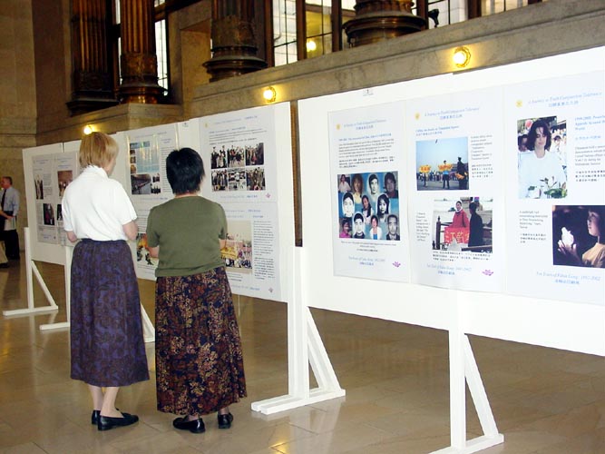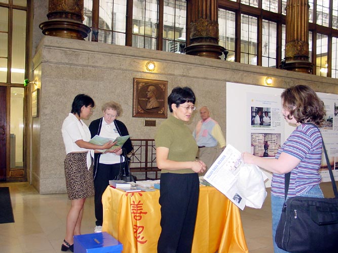 第一天早上,在学员们还没有把全部展板安装好之前,一位中年女士迫不及待地高兴地告诉我们说,她早就知道了法轮功,是她的太极拳老师告诉她的。她曾从一个图书馆里借了教功带,还在书店里买了一本《转法轮》并已经读过了,很喜欢。她一直在寻找什么地方可以学炼功法。今天看到我们太高兴了!她表示要尽快和我们学功。