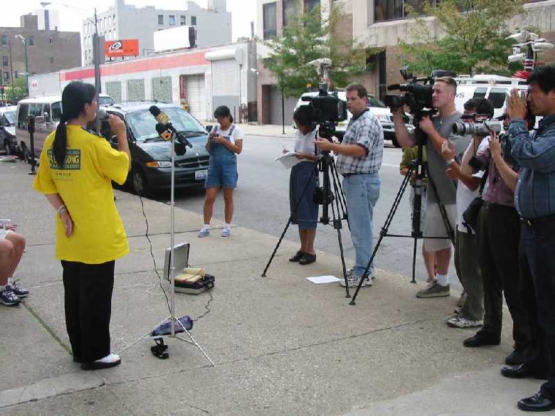 一年前发生于芝城的殴打法轮功学员案曾在当地引起轰动,被多家中西文媒体大幅报道。事情的经过是这样的:2001年9月初,芝加哥学员在中领馆前进行为期十天的接力绝食请愿,抗议中共集体杀害法轮功女学员。9月7日下午4点40分左右,三名男子驾驶一辆崭新的黑色吉普车停到中领馆前。下车上车多次,并对绝食的法轮功学员凶狠谩骂。绝食的鹿丰女士见状想去和他们讲清法轮功被迫害现况,走到司机旁座的车窗前,手送资料说:“我想给你们法轮功被迫害的资料。这么多中国老百姓只因为炼功就给迫害死了,你们也是中国人,你们就不在乎吗?”车中的三个人立刻破口大骂:“你们回中国去死吧!”“我打你!你信不信?”其中郑继明(音)对鹿女士做流氓动作,要暴露他的生殖器。站在马路对面的方霖先生掏出相机照下现场情况。车中的郑继明(音)和翁育军(音)立刻跳下车冲过来追打方霖。方霖头部和身上受到猛击,致使头晕、胸闷,呕吐,方霖的相机被抢去摔在地上,部份胶卷曝光。随后两人赶回车子,迅速逃离现场。在离开前,看到鹿丰正在记录车牌号,郑继明(音)恶狠狠地说:“你要告,我就杀了你!”。两分钟后,警察赶到。方霖身上多处有伤,被送到医院急诊。鹿丰女士表示,此后日夜接到沉默电话多次。