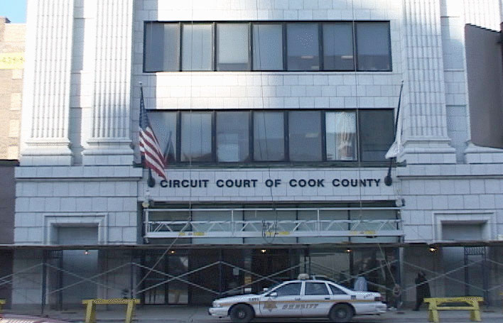 | 2002在8月27日郑继明(音,右)在进法庭时遮脸回避拍照。 | 2002年11月5日翁育军(音)从此处出来后被捕。2002在11月10日摄。 | 芝加哥库克郡法庭 |