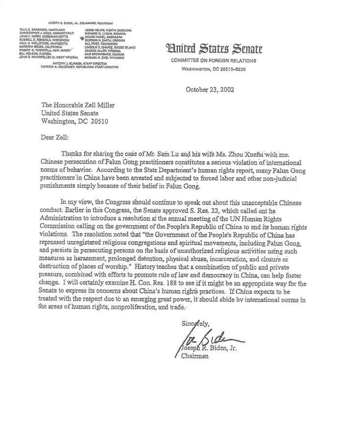 谢谢你告诉我关于萨姆·刘先生和他的妻子周雪菲的事情。中国[江氏集团]对法轮功修炼者的迫害严重违反了国际行为准则。根据国务院的人权报告,许多在中国的法轮功修炼者仅仅因为信仰法轮功而被拘捕,被强迫服劳役并受到其它不公正的处罚。