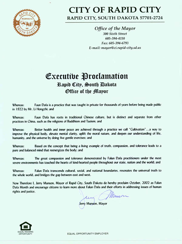因此现在,我,南达科他急流城(Rapid)市长杰瑞.蒙森,特此宣布2002年10月为“法轮大法月”,并鼓励市民们多了解法轮大法和他们〔法轮大法学员们〕在人权与正义问题上所做的努力。