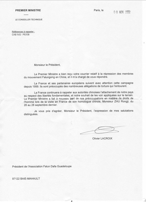 总理收悉您有关法轮功运动成员受到迫害的信件,他责成我答复您。