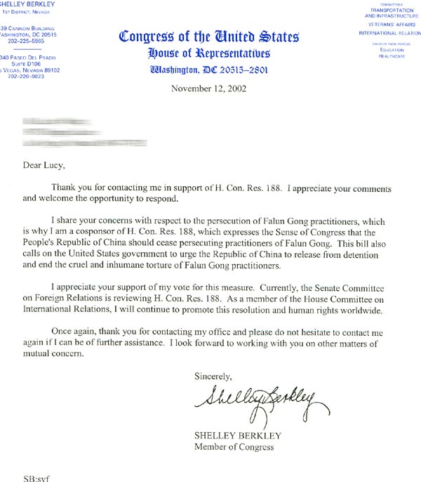 在法轮功学员遭受迫害的问题上,我与您有同感,这就是我成为188号议案共同发起人的原因。这项决议表达了众议院要求中国政府(江氏集团)必须停止镇压法轮功学员的意愿。此外,该决议还呼吁美国政府敦促中国政府释放被关押的法轮功学员,并停止对法轮功学员进行野蛮残忍的酷刑折磨。