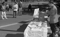在小雨中发了一天的材料,但仍有很多中国人不接受我们的材料,我真的心急呀,我便拿起自焚真相的展板高高举过头顶,在飘着细雨的人流中这块不太大的展板醒目地矗立在了街头,另一个同修也举起揭露迫害的展板站在我的身边。
