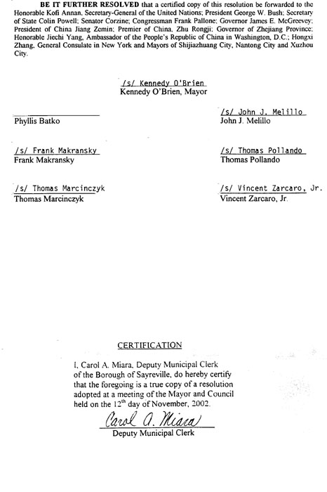 现在,赛瑞维尔市市长和议会做出决议,敦促中华人民共和国政府立即停止对法轮功学员的迫害,停止系统性洗脑和折磨,并敦促中华人民共和国政府立即释放所有被关押的法轮功学员;并且