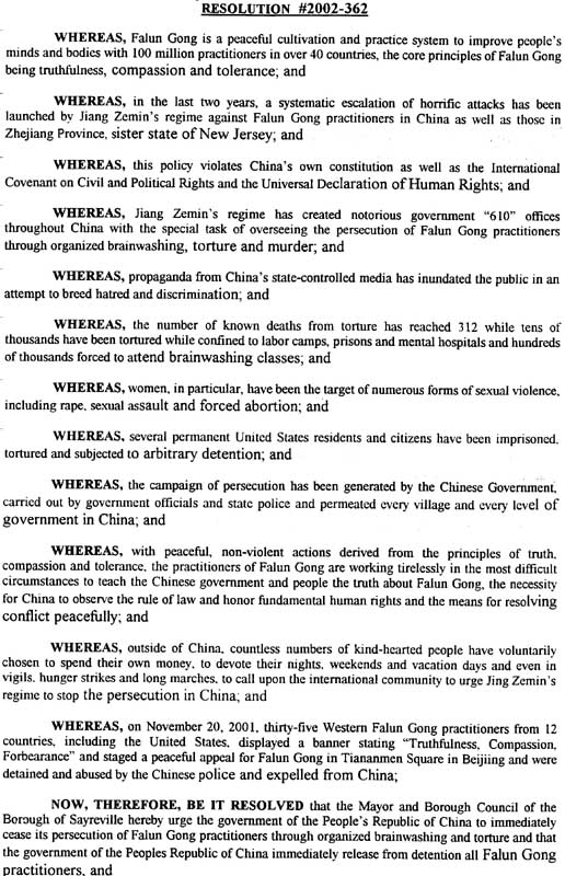鉴于,在过去的两年中,江XX政权发动了一场对中国法轮功学员的逐步升级的恐怖攻击,受害者也包括新泽西姊妹州浙江省的法轮功学员;并且