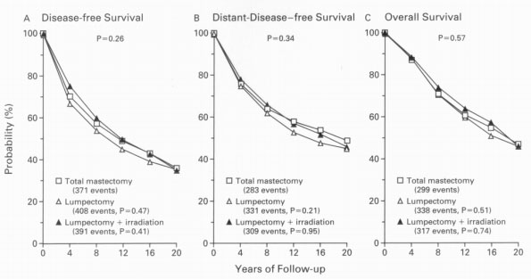 NSABP的另一项随机临床研究从1976年开始比较完全乳房切除术,单纯肿块切除术,和肿块切除术加上放射治疗对于侵入性乳腺癌的长期效果。有超过一千八百名妇女参加,近半数参加的病人肿瘤在2厘米以上,或有阳性淋巴结。他们发现三者在长期生存率(二十年)上没有显著差别。进一步的分析发现肿块切除术加上放射治疗显著减少了由乳腺癌所导致的死亡,但由于放射治疗所导致的其它死亡的增加部分抵消了这个差别[3]。1995年发表的由早期乳癌协作组(EBCTCG)所进行的相似的研究也发现乳房切除术与保留乳房的手术加上或不加放射治疗在十年生存上没有显著差别,2000年,早期乳癌协作组也发现了手术加放射治疗能减少由乳腺癌所导致的死亡,但同样导致了其它死亡的增加,二者相抵[2]。