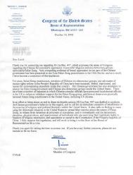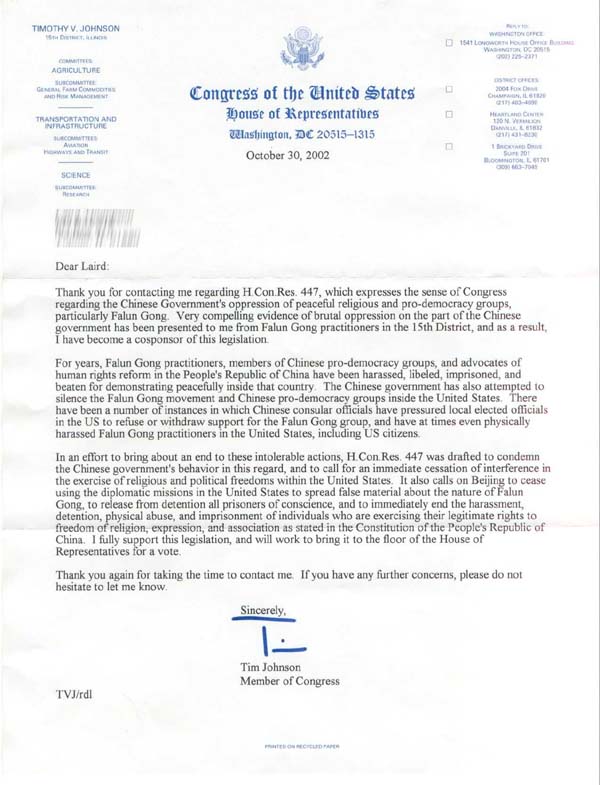 谢谢你就国会第447号议案给我的来信,该议案针对中国[江氏]政府镇压和平的宗教和民主团体,特别是法轮功,表达了国会的立场。居住在第15选区的法轮功修炼者已经将中国[江氏]政府残酷压制的触目惊心的证据送交给我,因此,我也成为这项议案的共同发起者。