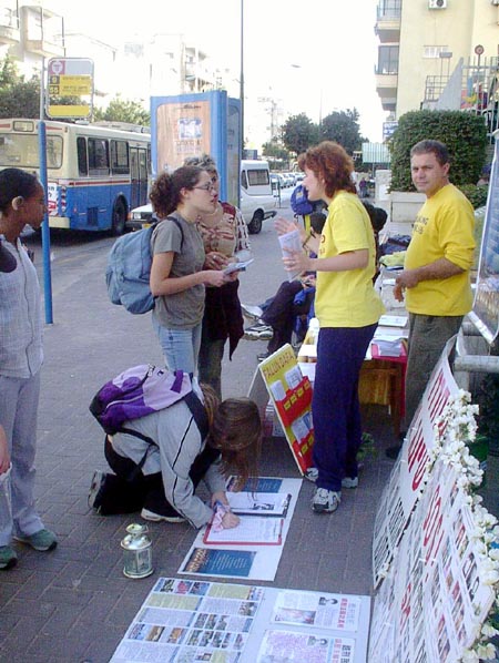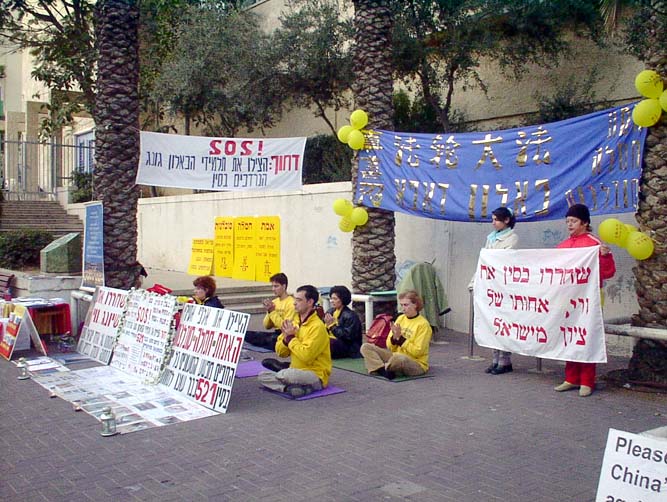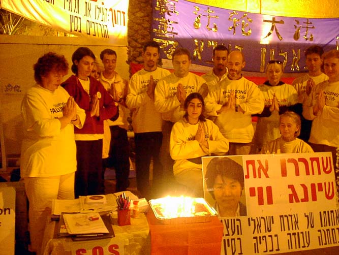 【明慧网2002年12月10日】以色列学员在周末2002年12月6日至8日连续三天58个小时在中使馆抗议对法轮功的镇压,营救熊伟。12月8号恰好是熊伟的32岁生日,以色列学员对因坚持真理而身陷劳改营里的同修熊伟给予祝福。