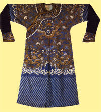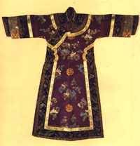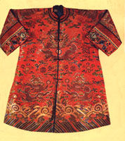 | 清─朱红缎彩绣女褂 | 清─紫纱套袖旗袍 | 清─蓝缎万字挑金龙袍 |