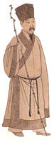 | 明朝读书人:着青布直身的宽大长衣。 | 明朝女装:短衫长裙,也就是襦裙,腰上系着绸带。 |