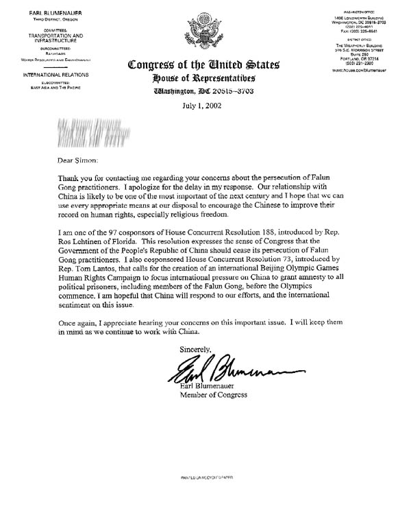 我是国会188决议97位联合发起人之一,这一决议由佛罗里达州国会议员罗丝.雷提娜提出。它表达了国会希望中国[江氏]政府停止对法轮功学员迫害的意愿。我也是国会议员汤姆.兰托斯提出的73号决议的联合发起人之一,这一决议建议发起“国际北京奥运会人权运动”,使国际社会一致向中国施压,令其在奥运会开幕之前特赦所有政治犯,包括法轮功学员。我希望中国在此问题上对我们的努力和国际呼声能做出回应。