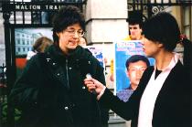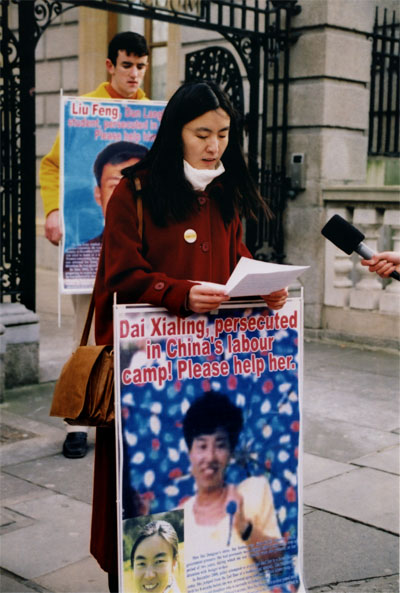 爱尔兰法轮功学员戴冬雪在发布会上讲述了她本人及她的两个姐姐、弟弟被中国江泽民政府洗脑、迫害的经历。戴本人在1999年底回国为法轮功上访被关押一周,后被“遣返”爱尔兰。其三姐戴秋霞在2001年12月被判三年劳教。二姐戴夏玲在被警察抓捕时从三楼跳下逃跑,把腰摔伤,被好心的邻居送走,大半年的时间在外流离失所,直到2001年8月再次被抓,也被强行送到劳教所。姐妹俩均被关押在济南女子劳教所。戴的弟弟也因修炼法轮功多次被非法关押。戴母因无法承受太多的家庭不幸遭遇,于去年十月份去世,被关押的两个姐姐均不准为其母探丧,戴冬雪本人因护照过期,中使馆不给更换护照,也不能回国奔丧。戴秋霞于今年9月被释放,但戴夏玲仍被关在劳教所。