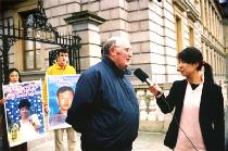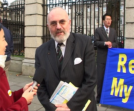爱尔兰法轮大法协会发言人,爱尔兰法轮大法学员奥康纳(O’Conner)先生在他的发言中希望爱尔兰政府进一步理解法轮功被迫害的严峻形势,并希望爱政府能象当时帮助营救赵明时那样努力,代表爱尔兰人民来帮助结束这场迫害、营救两位中国留学生自由返爱学习。
