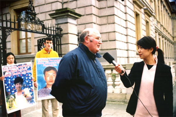 此外,爱尔兰参议员戴卫·诺若斯(David Norris)先生、国际特赦组织爱尔兰代表罗斯玛丽·瓦娜(Rosemary Warner)女士及爱尔兰法轮大法协会发言人杰瑞德·奥康纳(Gerald O’Conner)先生发表了讲话。诺若斯议员高度赞扬了爱尔兰法轮功学员没有忘记在中国被迫害的亲人和朋友的勇敢行为,表达了对中国(江XX集团)惧怕和迫害“真善忍”的不解和关注。国际特赦代表瓦娜女士对因修炼法轮功被阻止返爱就学的两位留学生的境况表示担忧,特别是深切忧虑目前仍被关押在劳教所的刘锋的境况,担心他会象赵明那样被残酷地酷刑折磨。诺若斯议员和瓦娜女士还对目前香港在大陆中央政府的压力下对基本法23条的立法表示极度关注,认为这完全是以法律的名义限制人权,其目的是将来可以合法地禁止象法轮功等组织的存在。