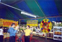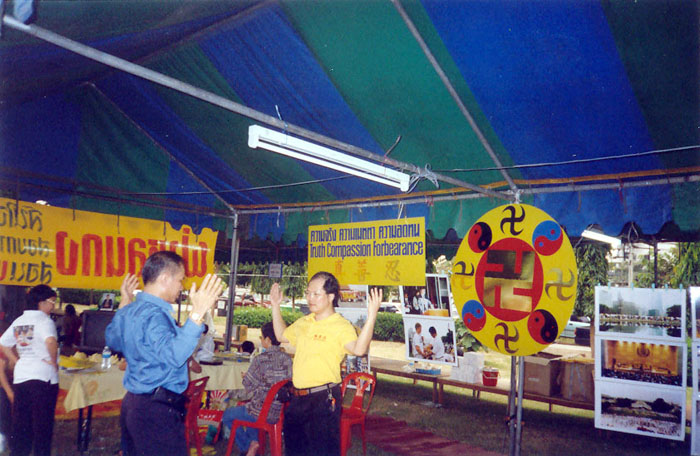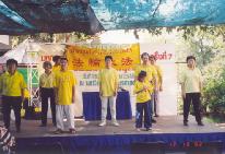 展览会设置了表演区,每天下午两点钟,身穿印有“法轮大法好”和“真 善 忍”字样黄色衣服的泰国学员,站在舞台上,在炼功音乐和详细的解说中,演示着五套功法,坐在台下的观众,不时有人举起手来模仿。