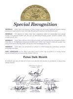 路伯克市特别褒奖鉴于:法轮大法,又称法轮功,是一种高层次传统中国气功修炼,旨在通过柔和的动作锻炼和打坐改善人们的精神和身体;而且鉴于:法轮大法的修炼对减轻压力和整体身心健康有着重要的作用,以最终达到慧悟为目标;而且鉴于,法轮大法提高人们的身体精神健康,使心灵升华,强调真善忍原则,帮助无数人们去除了不良习惯,转而追求更有意义的生活;而且鉴于:法轮大法自1998年通过举办免费教功班、讲座和集体炼功的方式传入路伯克;因此,现在,我们,路伯克市(Lubbock)市长及市议会,谨在此颁发特别褒奖,宣布2002年10月为路伯克市法轮大法月,同时邀请全体市民在法轮大法月期间参加活动并颂扬修炼法轮大法的自由。