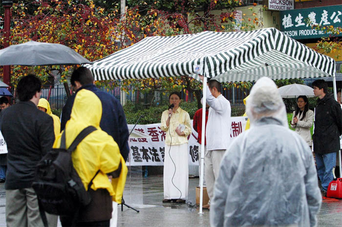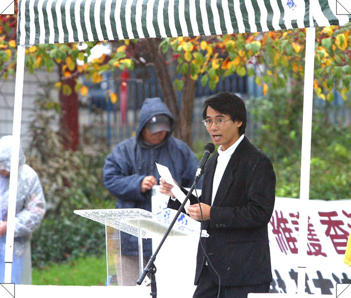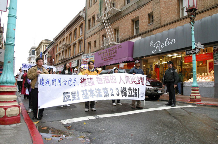 部分湾区法轮功学员也参加了12月14日的游行,学员代表并即席讲话,希望海外华人同心携手,维护香港的人权与法制,停止基本法第23条立法!