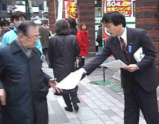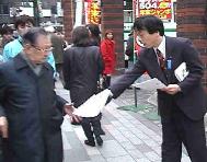 演说结束后,土井议员亲自拿着资料开始在街头发放,而且向拿取资料的行人鞠躬致谢。