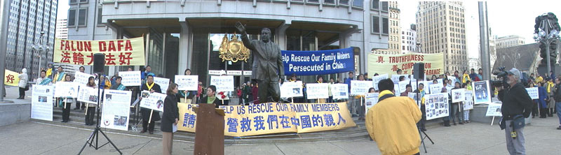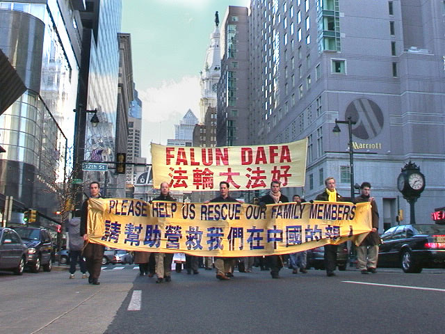 并呼吁帮助救援大陆学员。会后学员们举着巨型横幅在市中心举行了大游行。一些横幅上写着:“营救我们在中国的亲人”、“法轮大法好”,游行队伍前面的“真善忍”大字非常醒目。