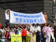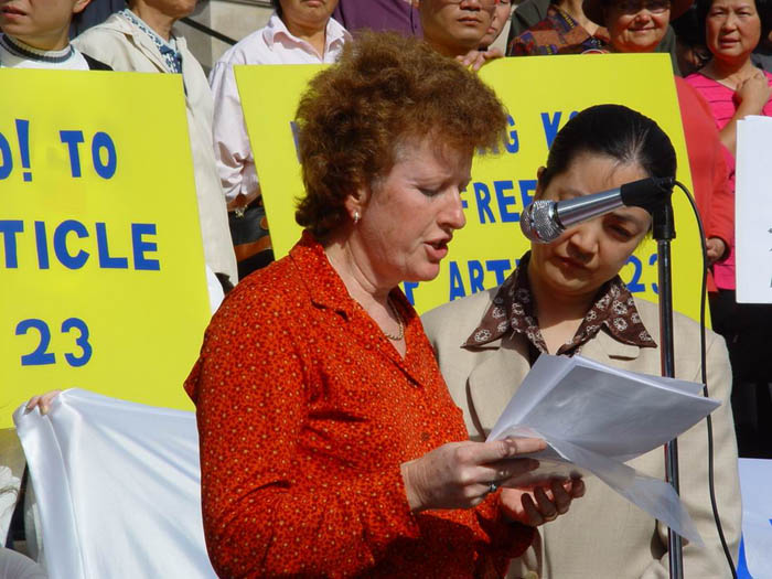 商业界代表陈丽丽女士诉说到:“我是一个商人,去年我到香港、中国旅游,曾无辜地被中国海关整整关押了一天一夜。最近,我又准备去香港购置设备。如果23条立法一旦成立的话,那么我在中国大陆遭受的那噩梦般的经历就会在香港重演,为此我感到恐惧,所以我强烈地反对香港23条立法。我也希望每一位海外华人,在香港人民的人身自由面临巨大威胁之际能站出来,为维护香港的民主和自由说句公道话。”