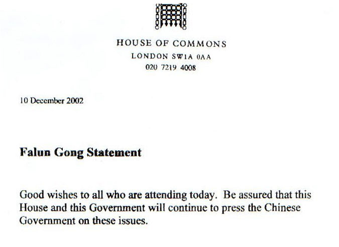向所有参加今天[人权日]集会的人们致以良好的祝愿。请相信:本议会和本政府将继续就这些问题敦促中国政府[改变态度]。