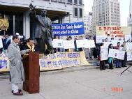 希望你们再接再厉,我会为你们加油。菲费市的现任市长今天在医院里,托我捎上他对大家的问候和支持。他感到很遗憾不能到场,他预祝你们能收集到足够的签名和声援,在自由广场竖起真善忍的纪念碑。